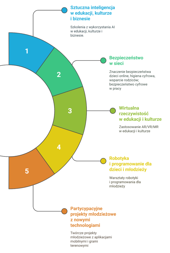 Prowadzimy warsztaty dotyczące podstaw nauki programowania i robotyki wykorzystując tematyczną pracownię LEGO® Education (mechanika, fizyka, pneumatyka, energia odnawialna, nauki humanistyczne itp.). Prowadzimy działania profilaktyczne z zakresu bezpieczeństwa dzieci w sieci, organizujemy strefy interaktywne (VR, AR) oraz gry terenowe oparte o nasz autorski system.
